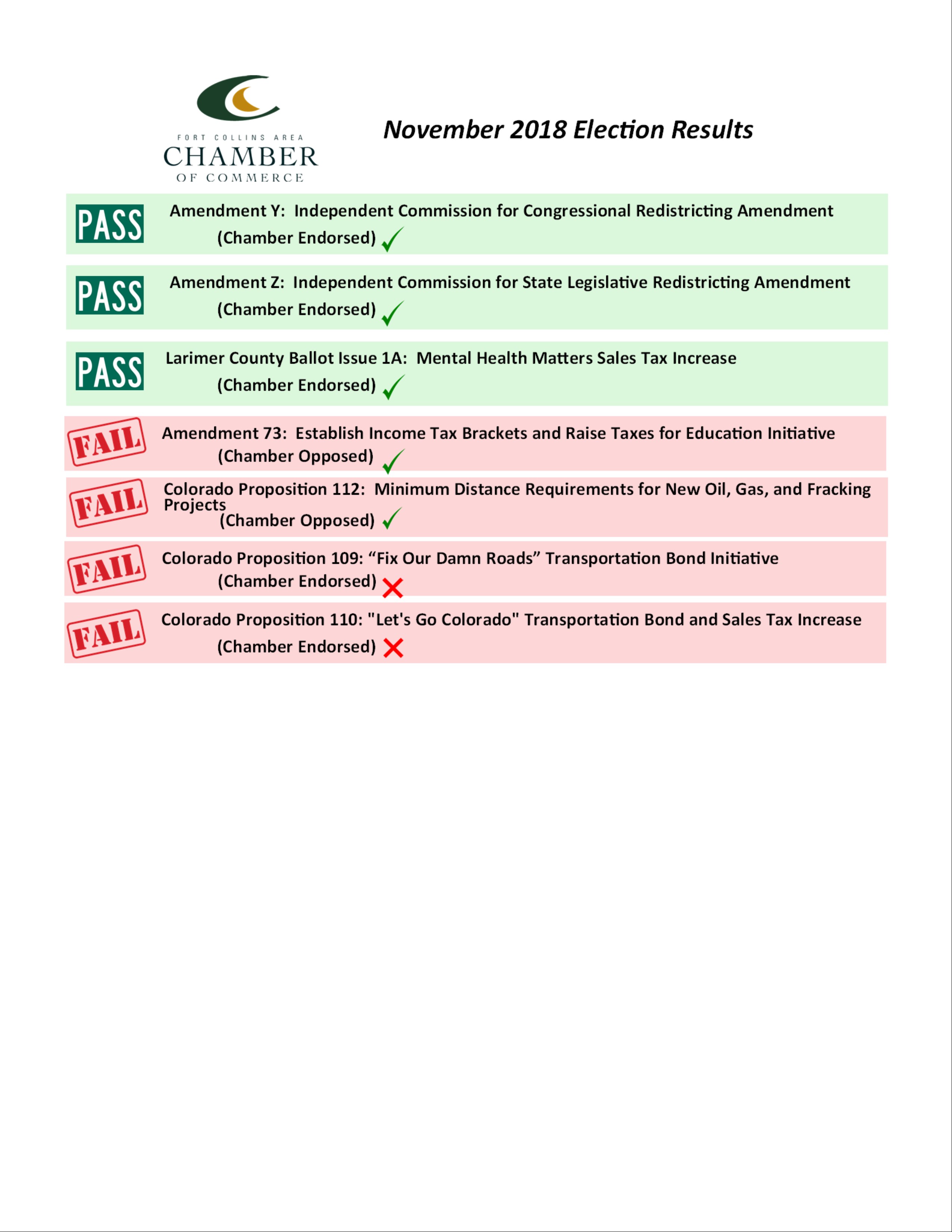 “These measures could have provided a funding source to help with the transportation problem. It is now back to the drawing board to convince our state and regional leaders to make transportation a top priority for the future,” said David May, Fort Collins Area Chamber of Commerce President and CEO.
